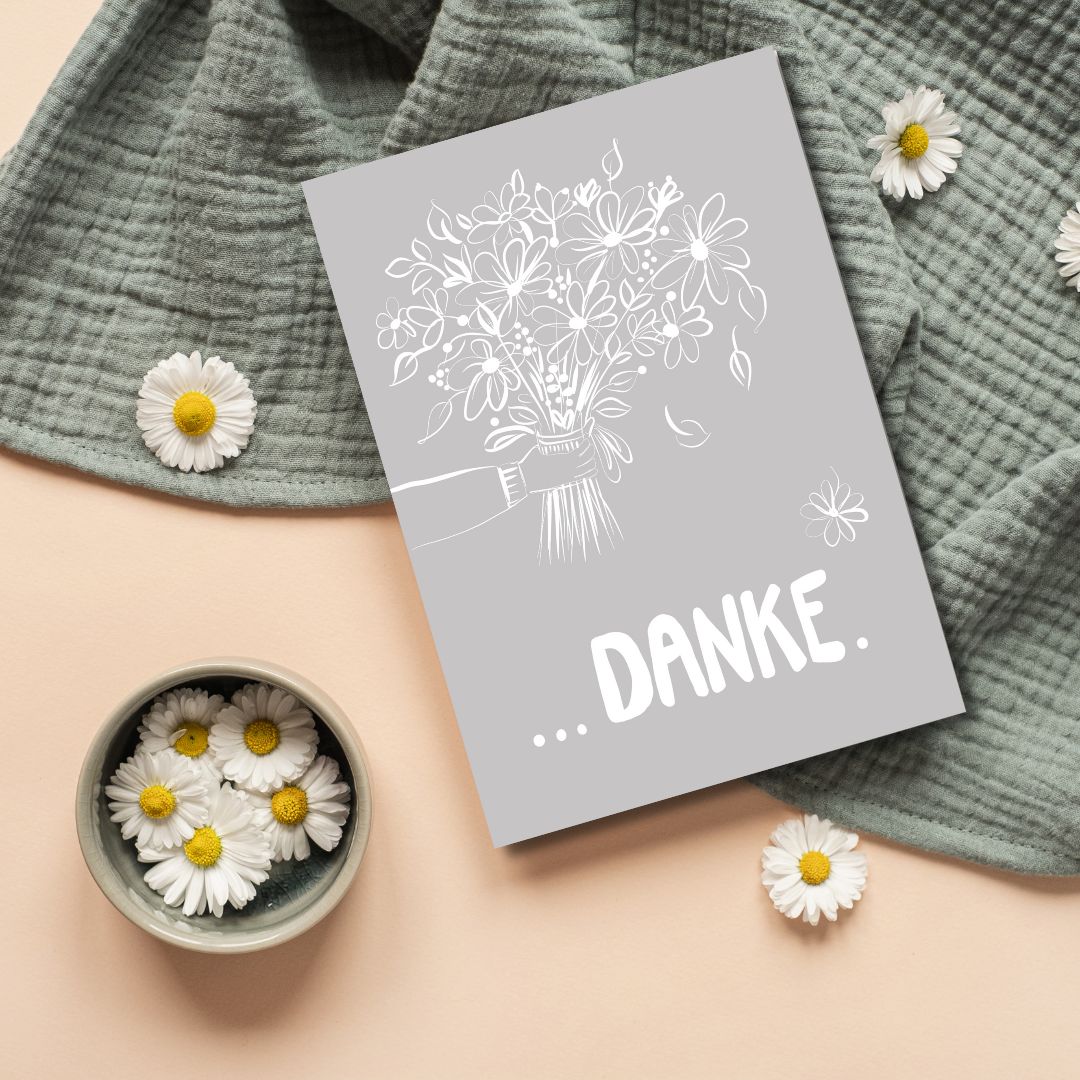 FREEBIE - kostenlose Dankekarten mit einem Blumenstrauss in drei Farbvarianten. Rosa, mintgrün, grau.
