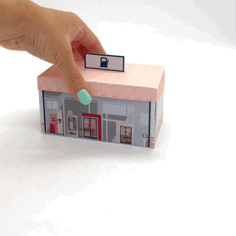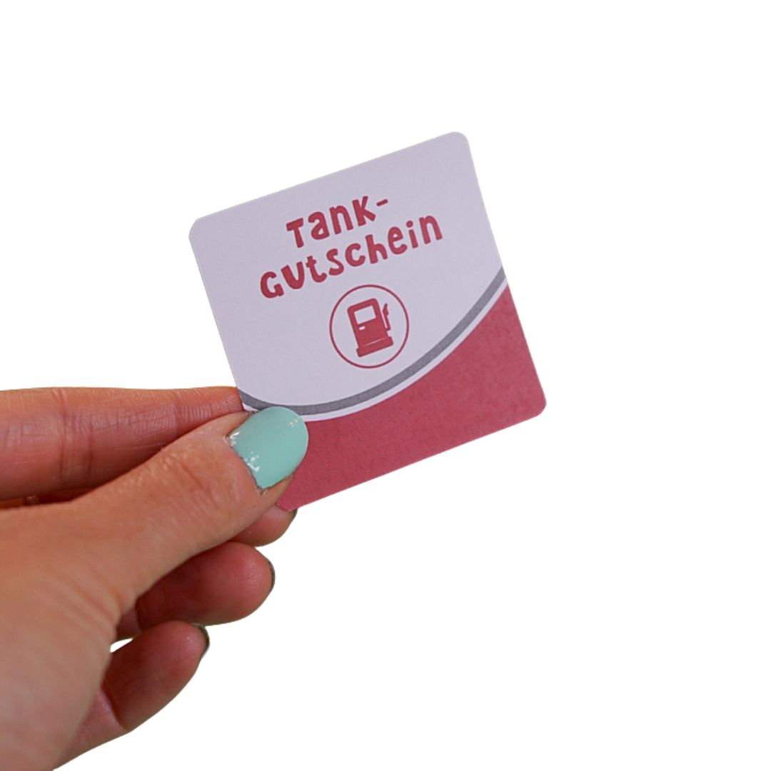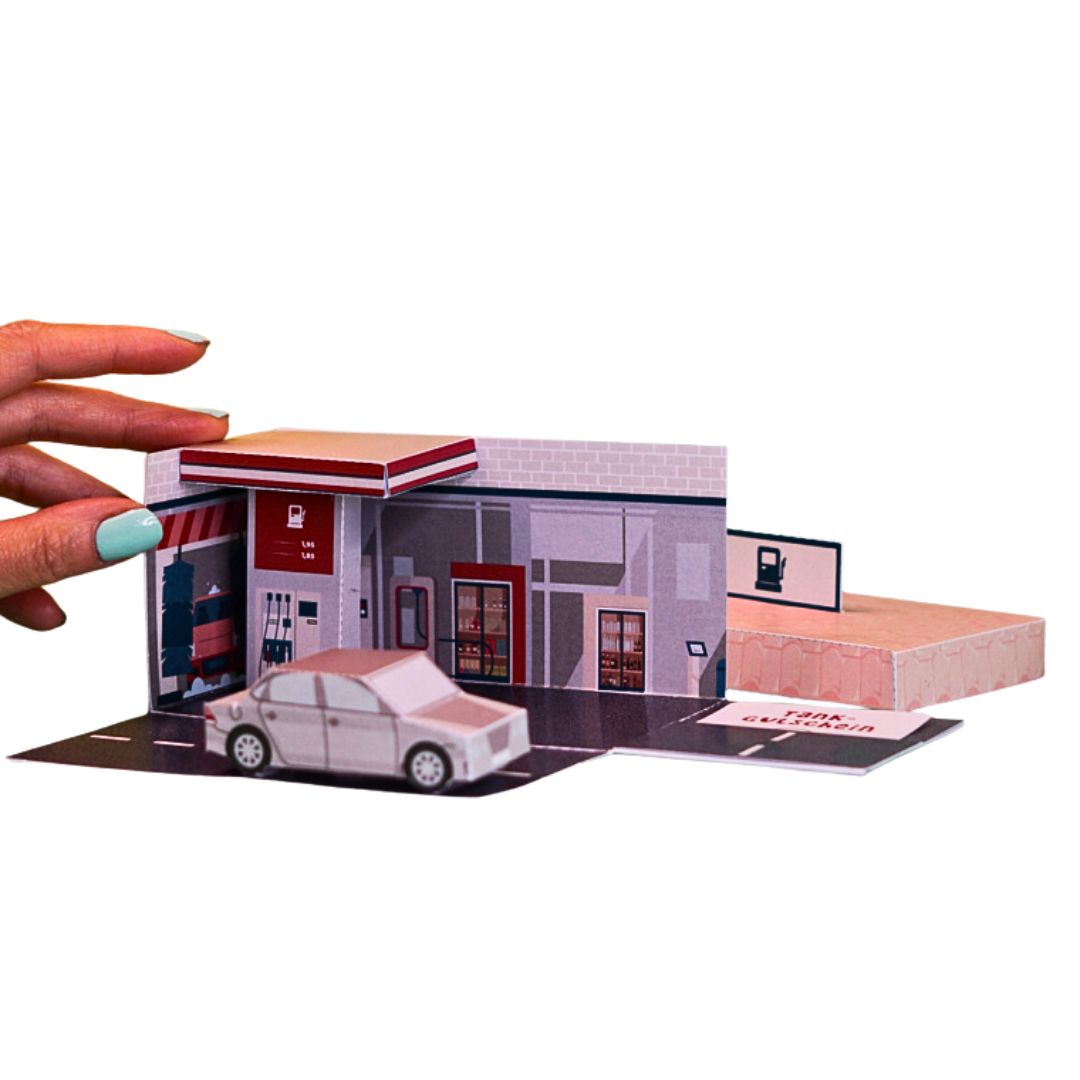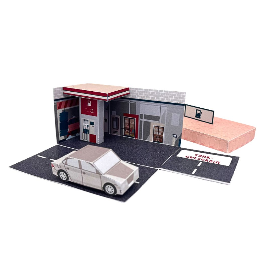- Fertige Box: zusammengeklappt wie ein kleines Tankstellenhaus, aufgeklappt wie eine Mini-Tankstelle mit Zapfsäule, Auto und Kärtchen für den Gutschein