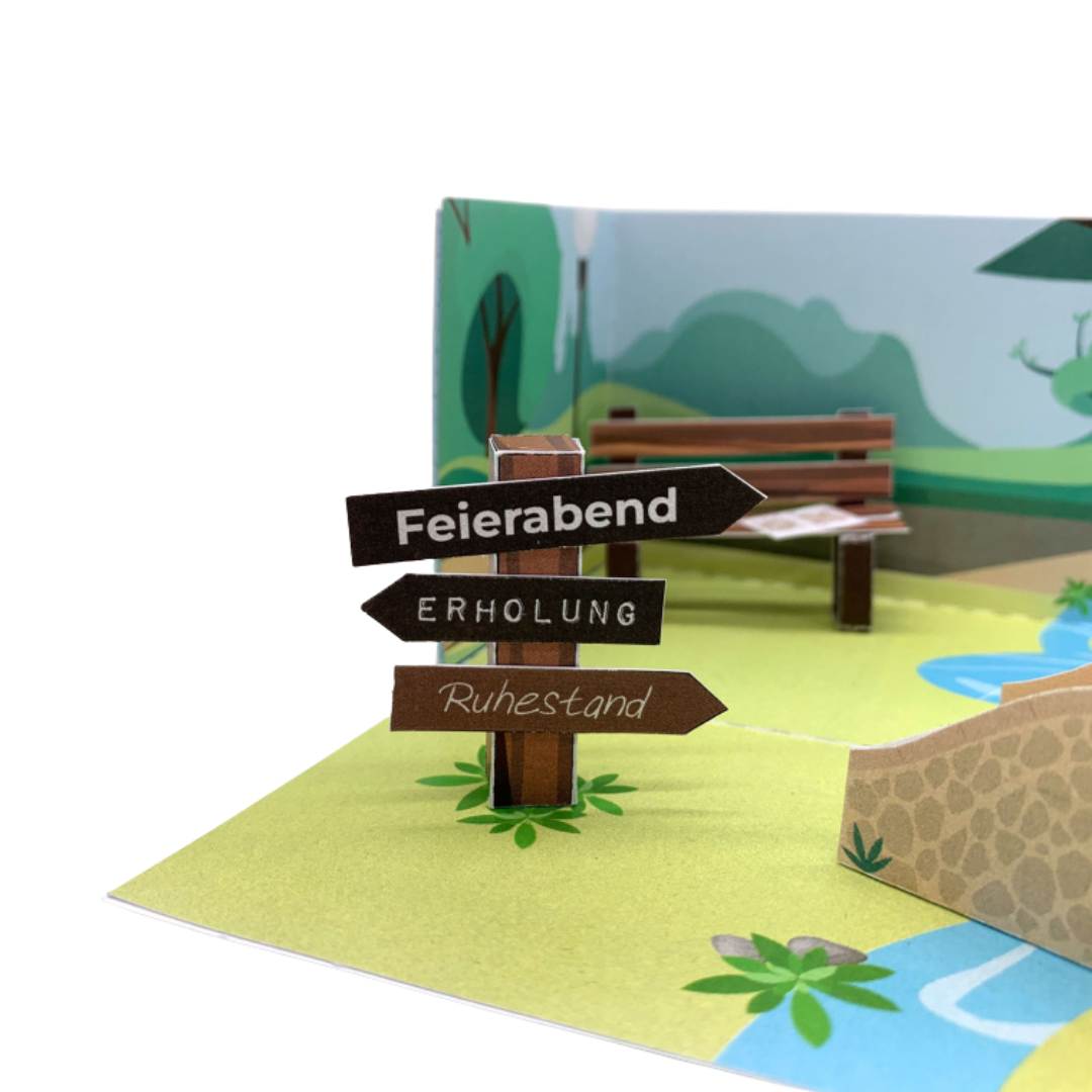 Von außen wirkt die Box schlicht und kompakt. Auf dem Deckel steht „Endlich Feierabend“. Beim Öffnen entfaltet sich eine kleine Parklandschaft mit Weg, See, Brücke und Wegweiserschild. Zusätzlich hast du Platz für eine Mini-Karte, persönliche Worte und vielleicht auch eine kleine Überraschung.