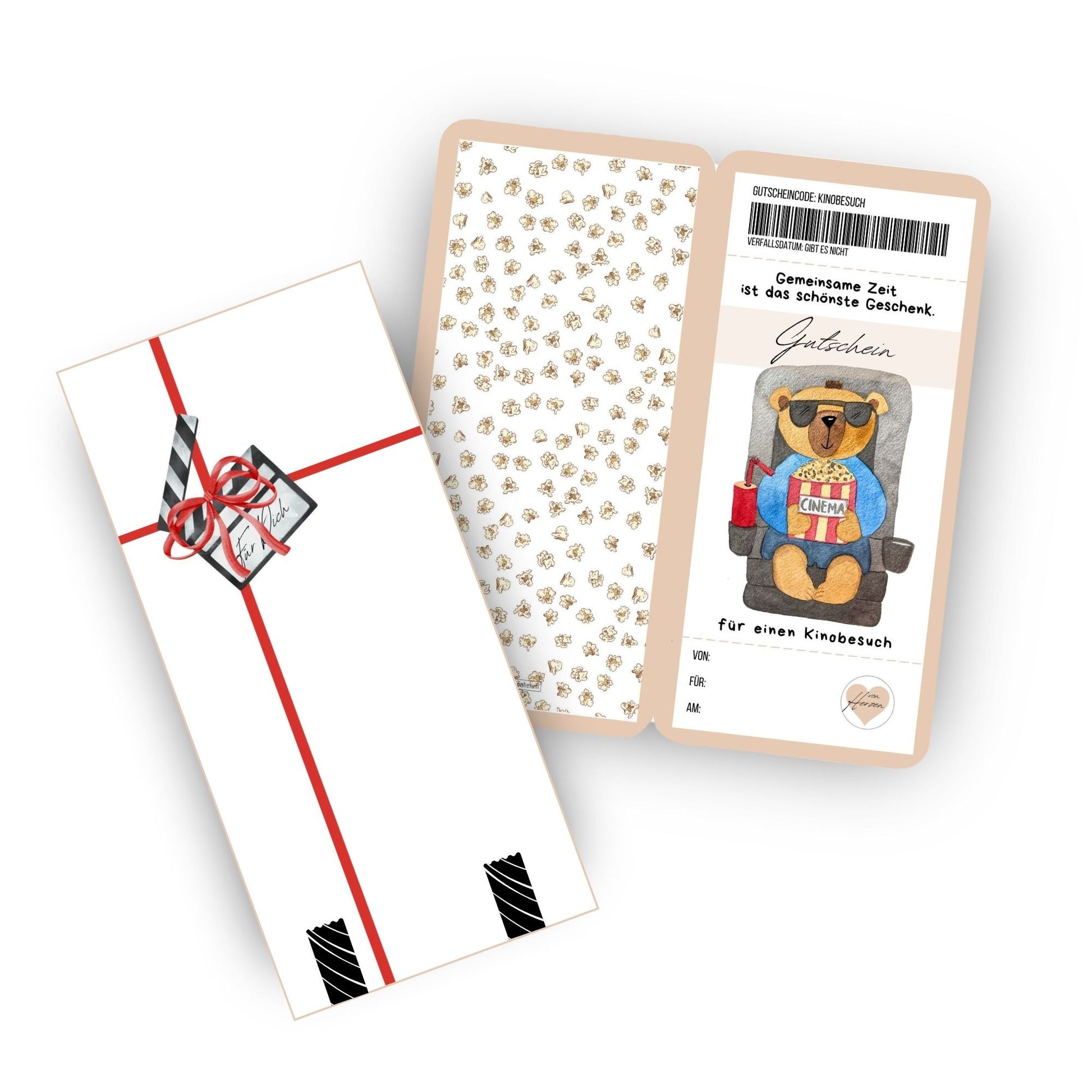 - Gutscheinkarte mit Vorderseite Kino-Bär und Rückseite Popcorn