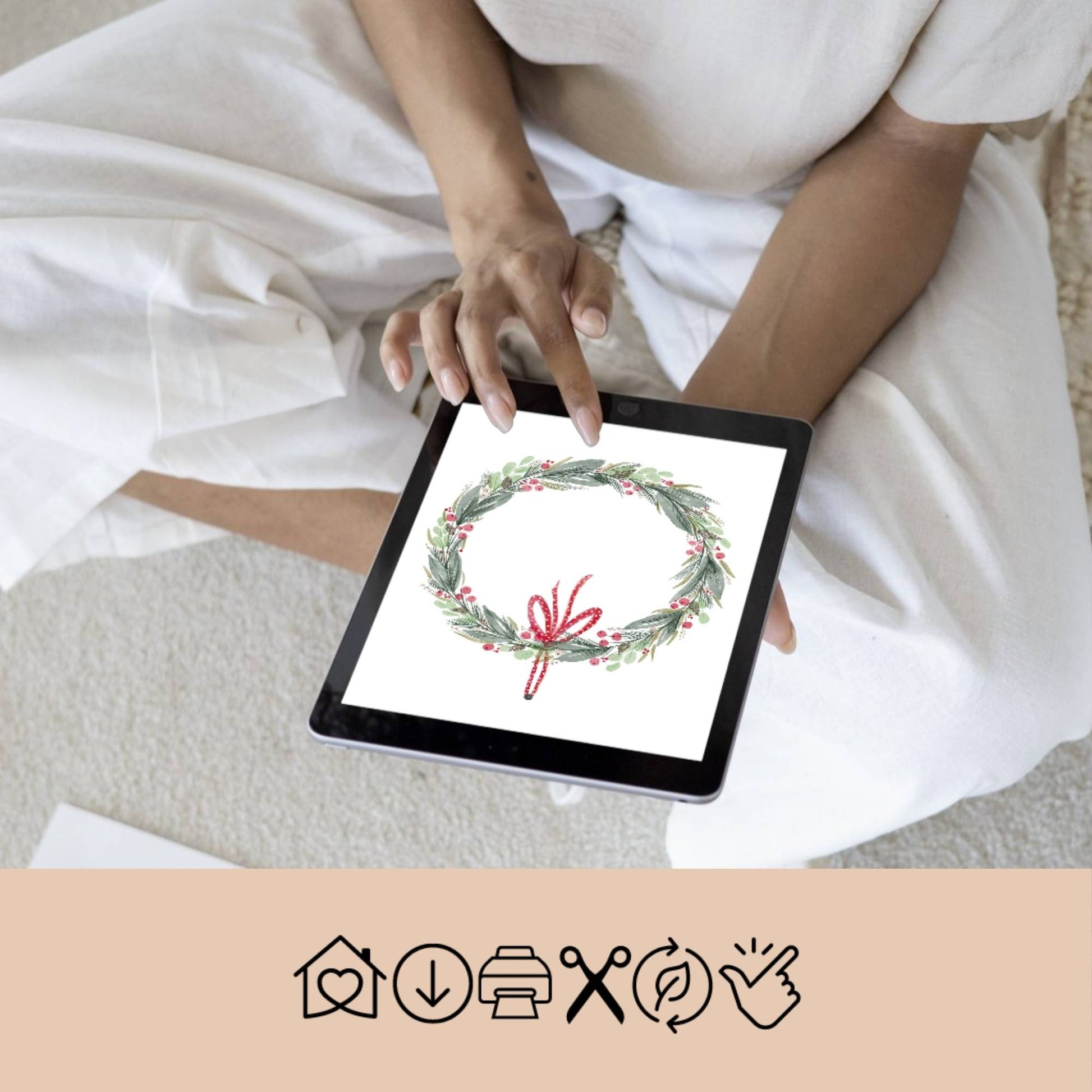 DIY-Weihnachtskarte – Schlichter Kranz mit Zweigen, Beeren und Schleife zum Selberdrucken