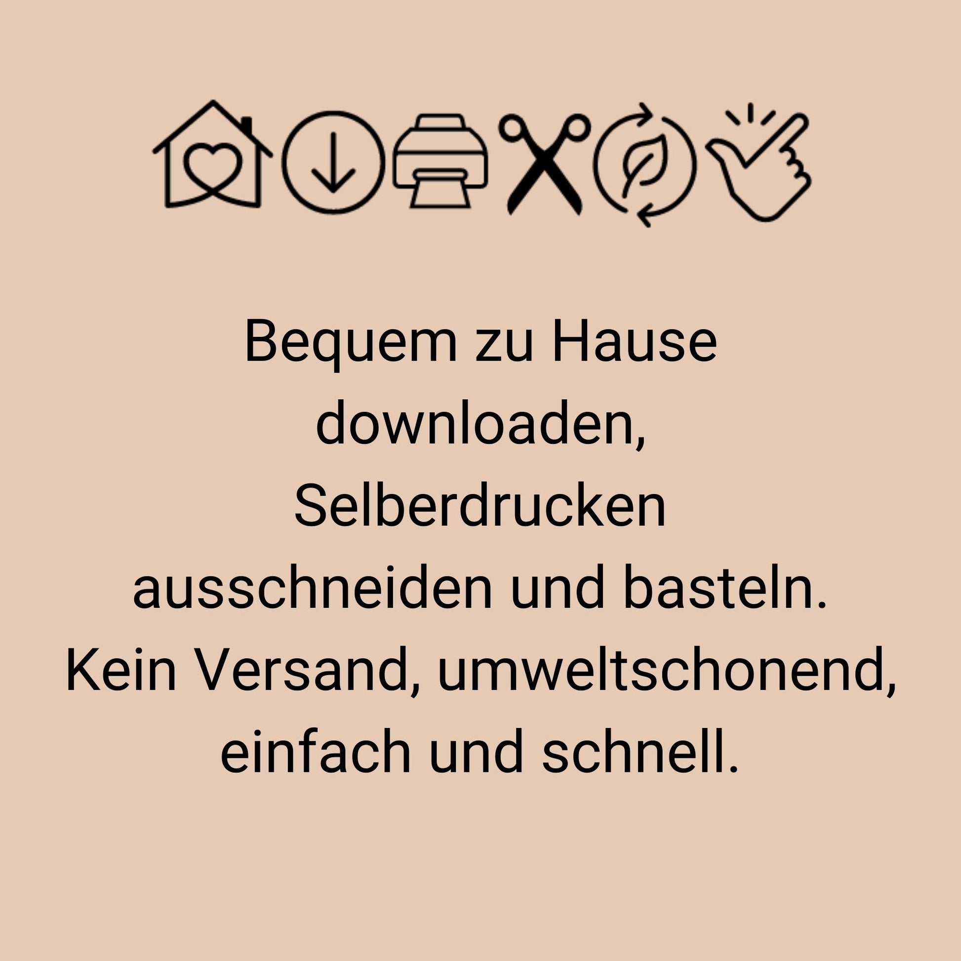 Drucke die Vorlage zu Hause aus, schneide sie aus, falte sie – fertig ist deine schnelle Last-Minute Weihnachtskarte mit passendem Umschlag.