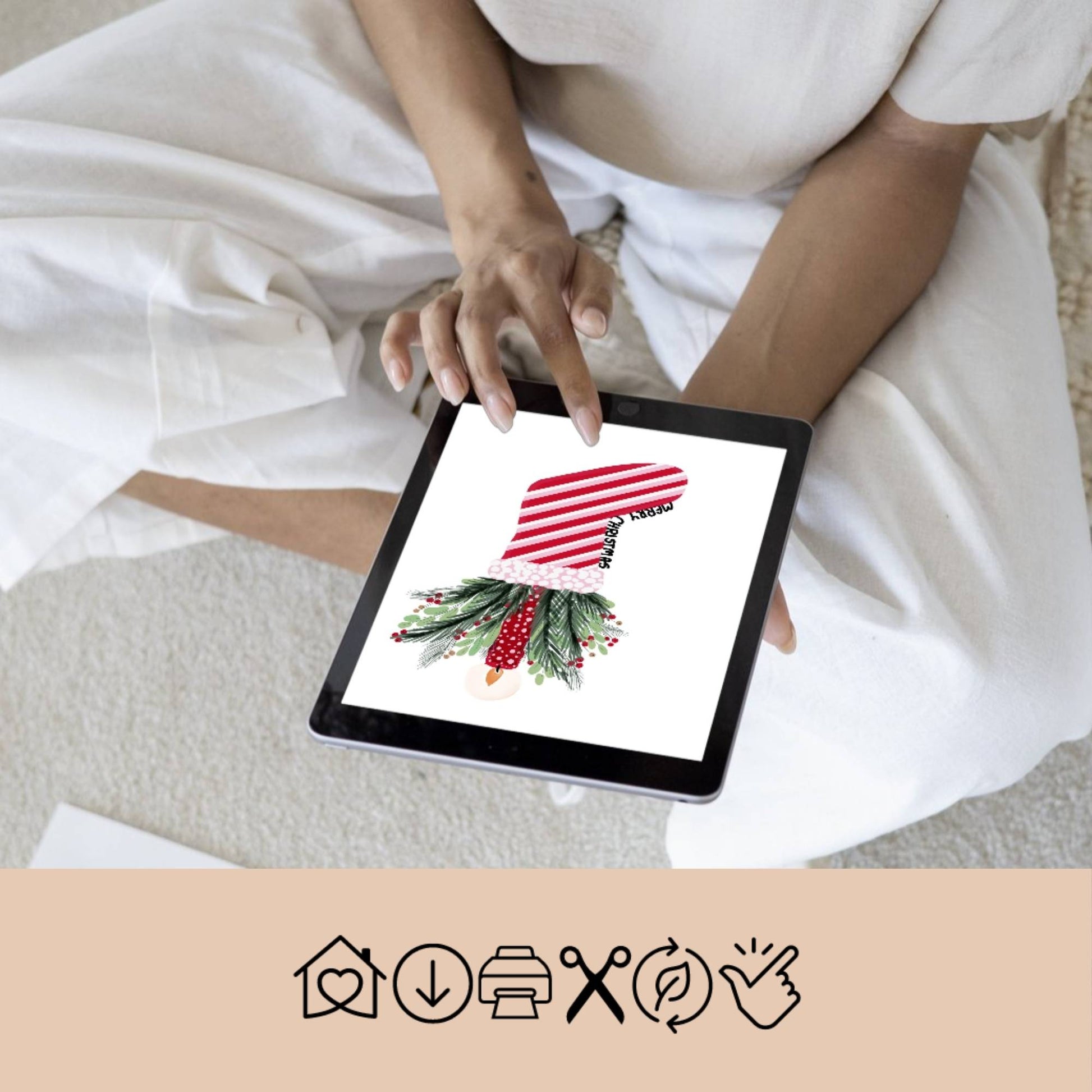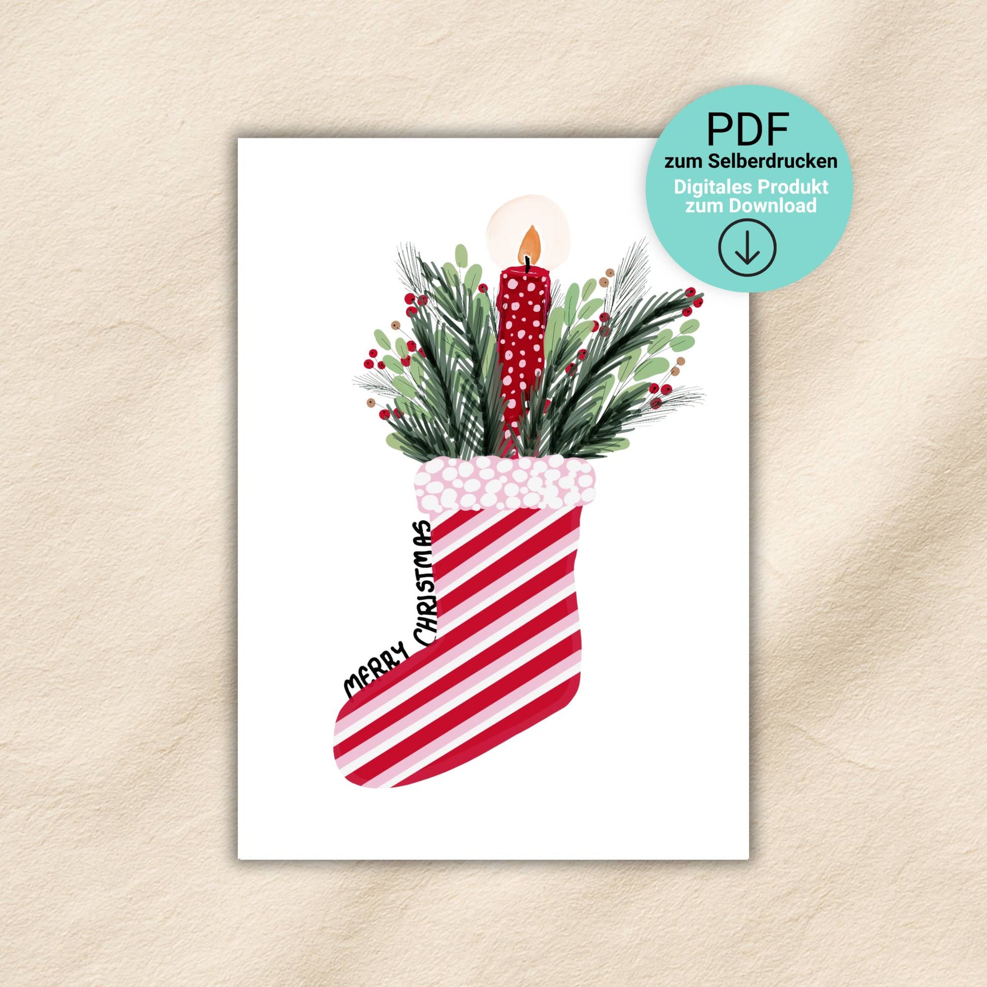 DIY-Weihnachtskarte – Weihnachtsstiefel mit Kerze und Tannengrün zum Selberdrucken